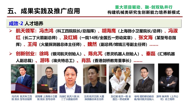 1)工程能力显著提升,论文选题80%以上源于载人航天、探月工程等170余项重大项目,助力研制出月球车、火星车、月面采样装置、空间机械臂等国之重器,学生科技攻关成果支撑获国家级科技奖11项、省部级科技奖90余项。