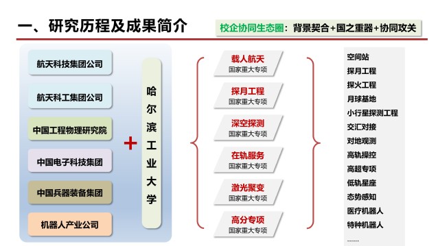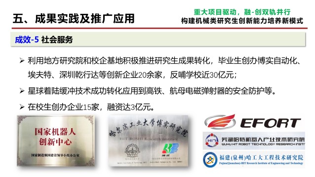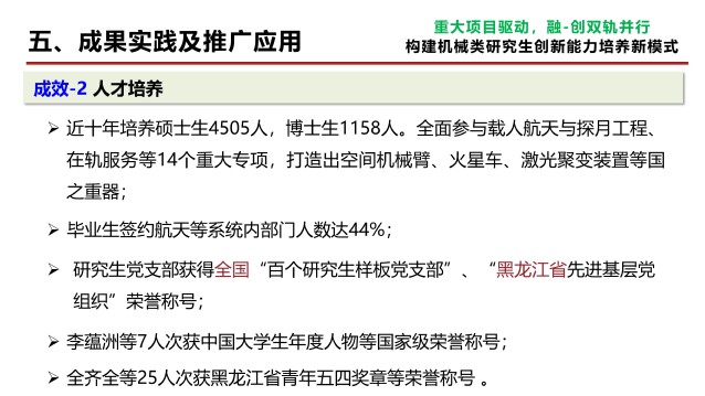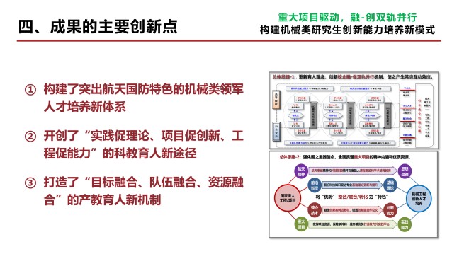 在邓宗全院士、刘宏院士主导下,机械工程学科紧密围绕航天与国防重点领域,发挥产学研协同优势,系统实施了“重大项目驱动、融-促双轨并行”的教学改革措施,构建了机械类研究生创新能力培养新模式: