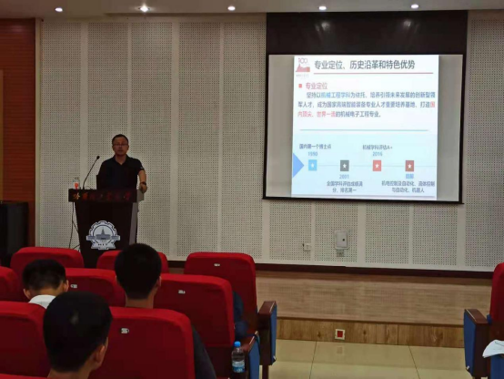 18时专业宣传讲座正式开始,彭高亮老师首先为同学们介绍自己的科研成果,并就机电控制及自动化系向同学们进行了提纲挈领的介绍,针对自己的数字化设计与制造技术、机器人伺服控制技术、特种装备新型机构及控制技术以及特种装备智能监测与状态评估技术几方面向同学们进行了介绍。